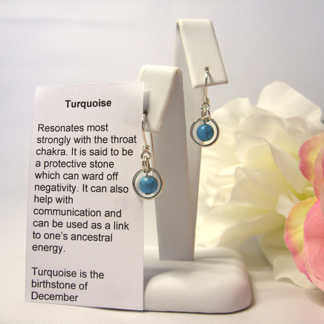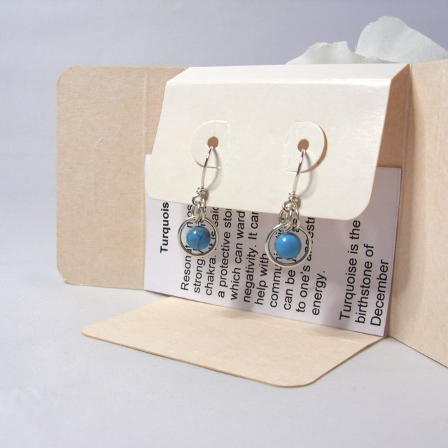 The Turquoise gemstone bead measures 6 mm in diameter & the outer silver ring 8 mm in diameter. The recycled silver hand-crafted ear wires are designed to be comfortable and secure. The overall drop from the ear wire is approximately 12 mm.