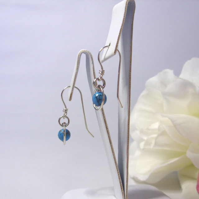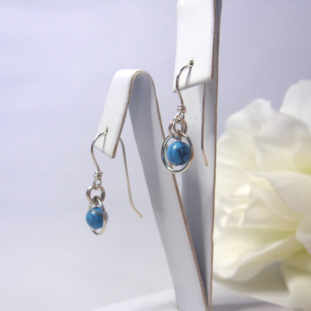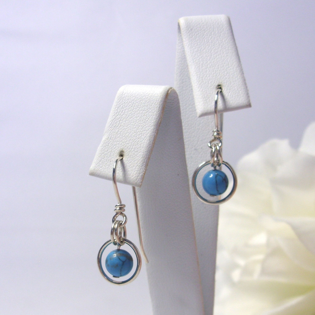 These hand-crafted dangle earrings feature a beautiful Turquoise blue gemstone bead set in a ring of recycled silver.