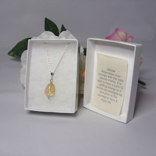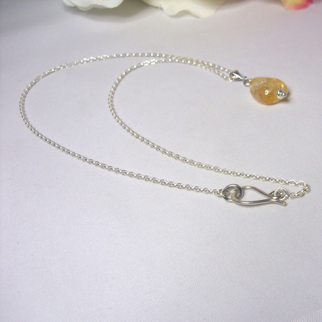 This simple yet stylish drop pendant necklace features a beautiful Citrine bead of sunshine yellow in colour and silver chain with a hand-crafted hook and eye clasp which is easy to do up and undo.