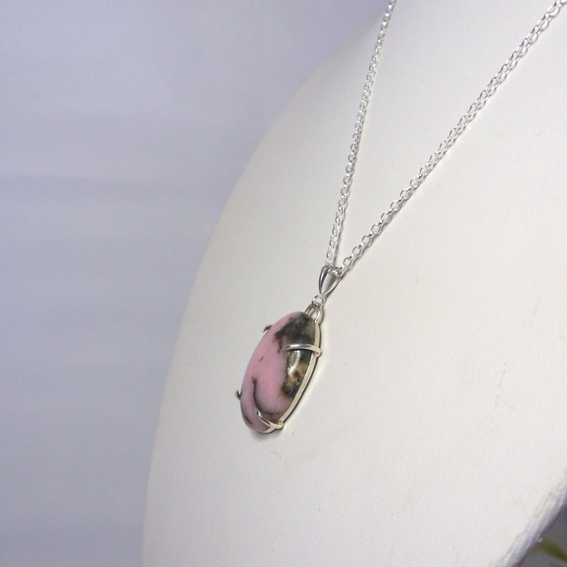 This beautiful Rhodonite gemstone claw set pendant necklace is one of a kind. Due to the patterning of the Rhodonite with its varying shades of pink and black, no two gemstones are ever the same.